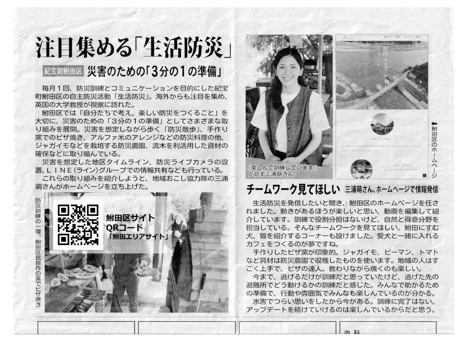 熊野新聞社発行の「防災特集2024」にて鮒田地区が紹介されました。防災特集は、毎年9月1日の「防災の日」にあたって制作発行され、三重県熊野市~和歌山県串本町エリアを中心に配布されています。